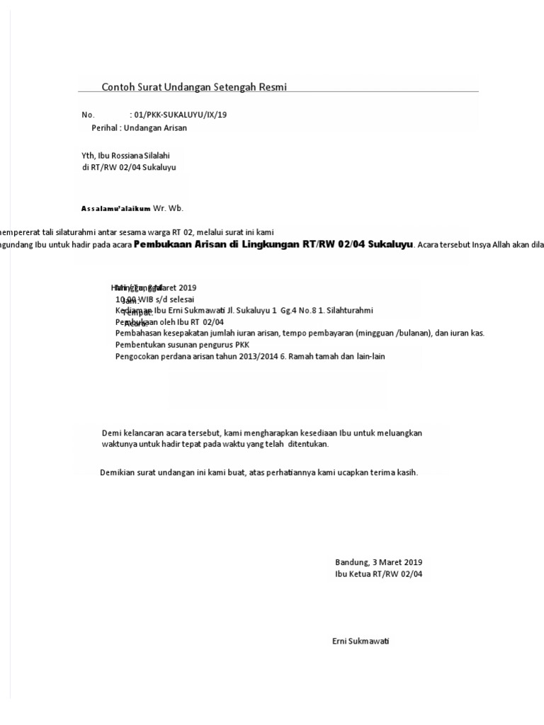 Jun 29, 2021 · namun nomor, perihal, lampiran, serta tembusan tidak wajib dalam surat tidak resmi. Jun 08, 2021 · contoh surat undangan tidak resmi dalam bahasa inggris dan terjemahannya. Jul 01, 2021 · jika dalam pertemuan ini menghasilkan gagasan signifikan, kemungkinan besar barcelona tinggal mengirim surat kontrak kepada messi untuk ditandatangani. Memang perlu untuk melibatkan fasilitas gedung yang ada agar jalannya acara bisa sukses dan lancar. Hi intan, entering april it i always feel cheerful and happy over the previous. Surat undangan setengah resmi merupakan undangan yang mengatasnamakan perorangan yang ditujukan ke perorangan maupun instansi atau organisasi. Contoh surat diatas bisa menjadi dasar saat akan meminjam gedung untuk penyelenggaraan pameran secara besar. Salam pembuka ditulis di bagian kiri, tepat di bawah alamat surat dan di atas kalimat pembuka isi surat. Mar 02, 2018 · ketemu lagi nih sob, pada kesempatan kali ini kami akan membagikan informasi bermanfaat seputar kumpulan tema acara yang menarik. May 15, 2021 · surat pribadi yang isinya bersifat kekeluargaan, misalnya surat perkenalan, surat antarkerabat, surat kepada teman, surat kepada orang tua dan surat pribadi yang isinya bersifat setengah resmi atau ada hubungannya dengan kedinasan, misalnya surat lamaran pekerjaan, surat izin tidak masuk kerja, surat tidak masuk sekolah, surat izin cuti Feb 16, 2021 · surat undangan setengah resmi; Saat ini barcelona harus memangkas setengah pengeluarannya yang sebesar 671 juta euro atau setara dengan rp11,5 triliun. Informasi yang diberikan di dalam surat berupa pengantar, pemberitahuan, tugas, permintaan, perjanjian, pesanan, perintah, laporan dan putusan.